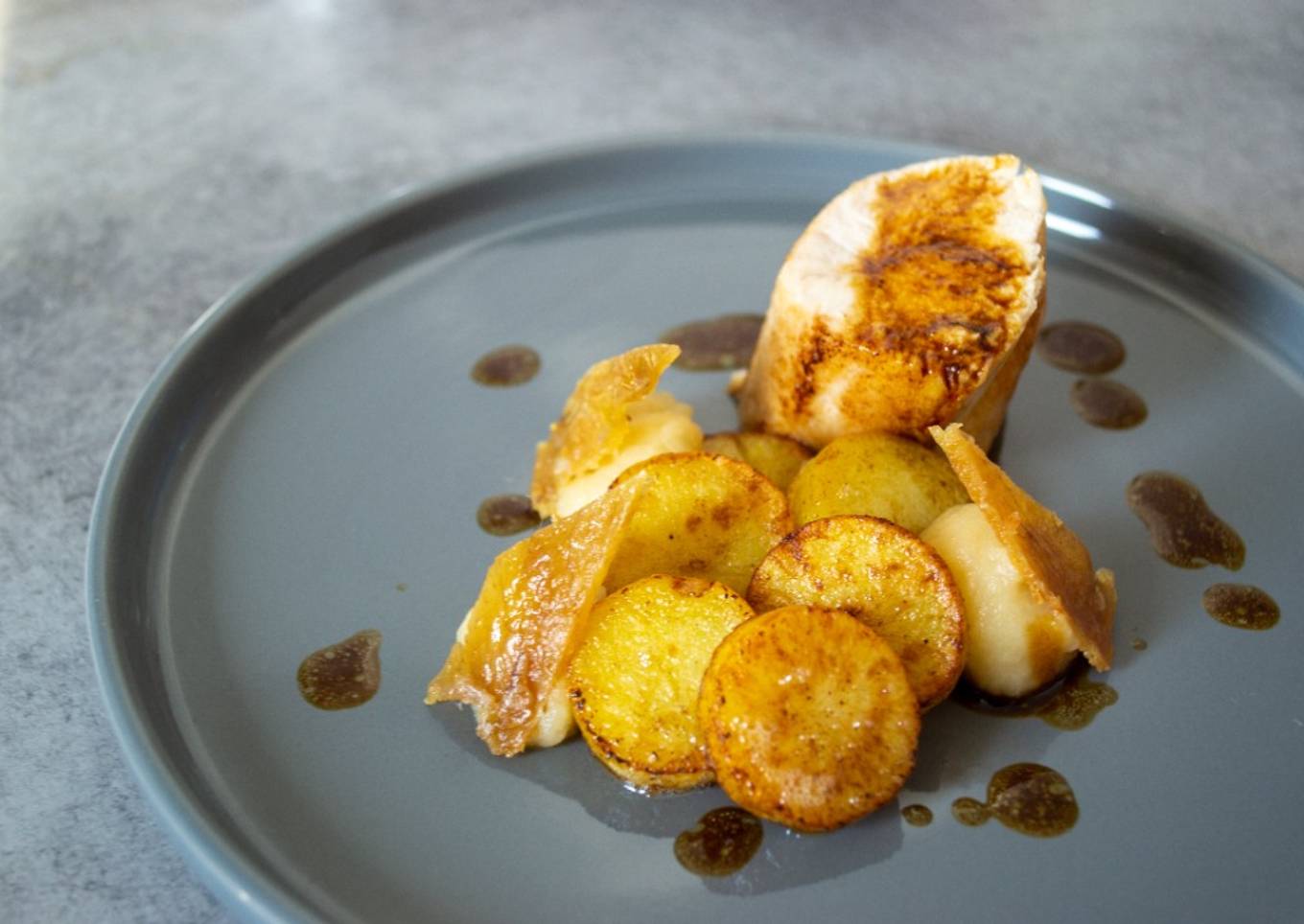 Ballotine de poulet, pommes de terre rissolées, compote et chips de peau de poulet