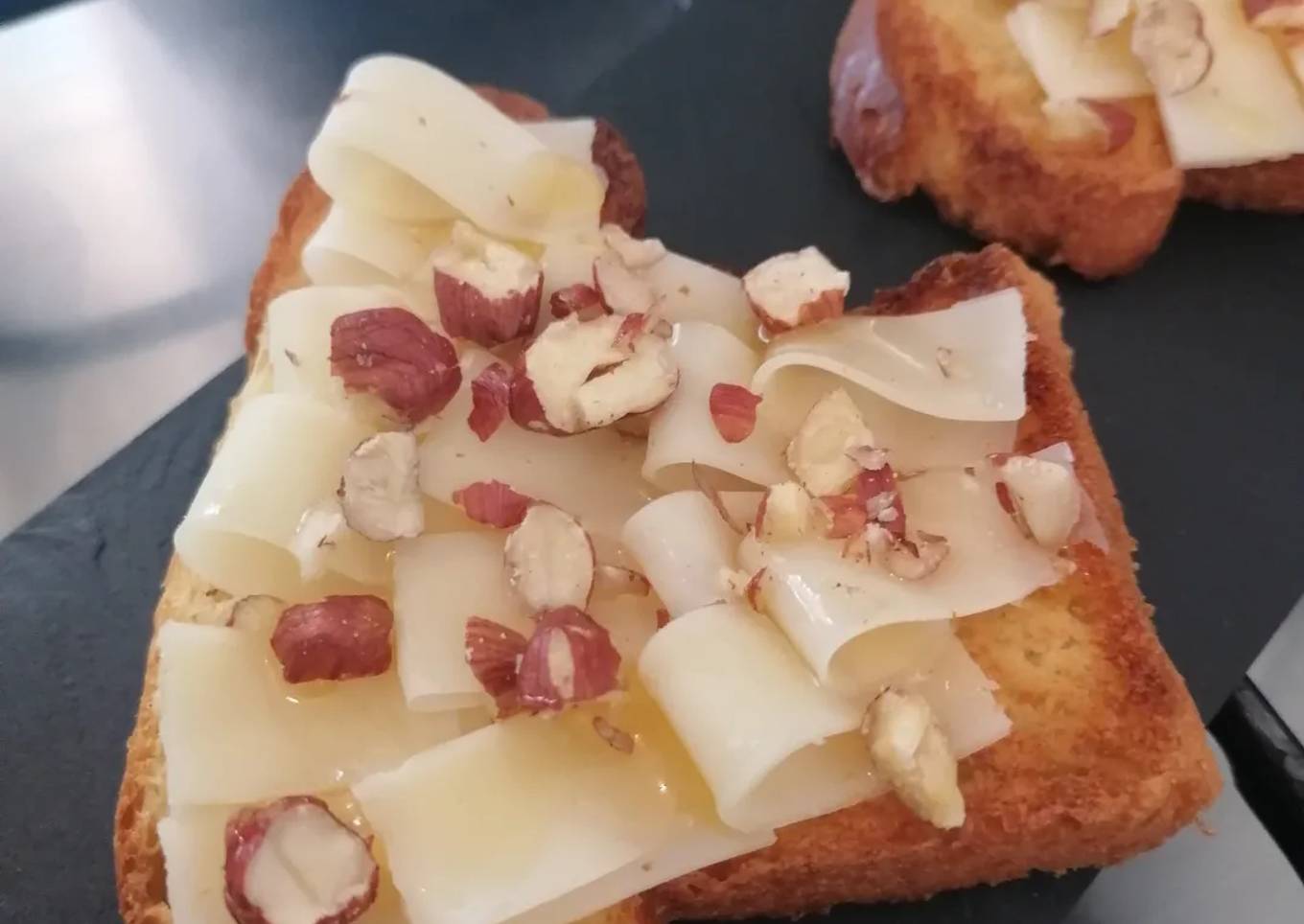 - Déposer les lamelles de comté, mettez des traits de miel dessus puis les noisettes concassées, déguster aussitôt.