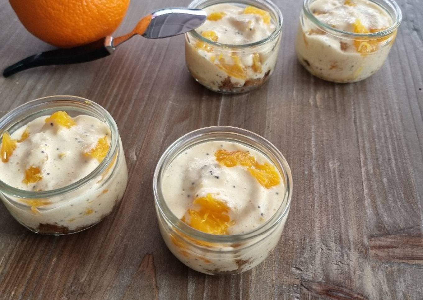 - Répartir le pain d'épice au fond des verrines, ajoutez une couche de crème et les quartiers d'orange, terminez avec le reste de la crème