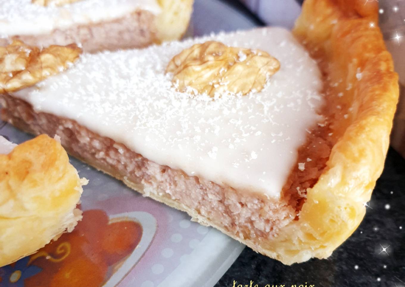 Voici une délicieuse tarte au noix sucrée avec son bon goût de rhum 😋 et son glaçage.